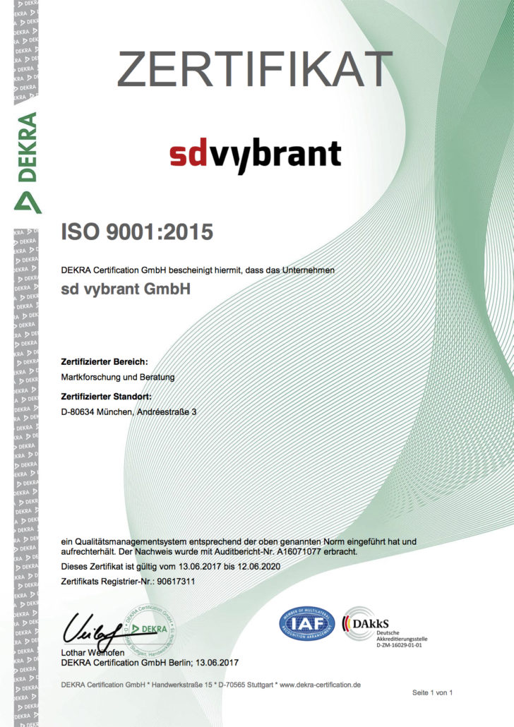 München, 17. Juli 2017: Die sd vybrant GmbH hat im Juni 2017 das international anerkannte Qualitätszertifikat DIN EN ISO 9001:2015 erworben.